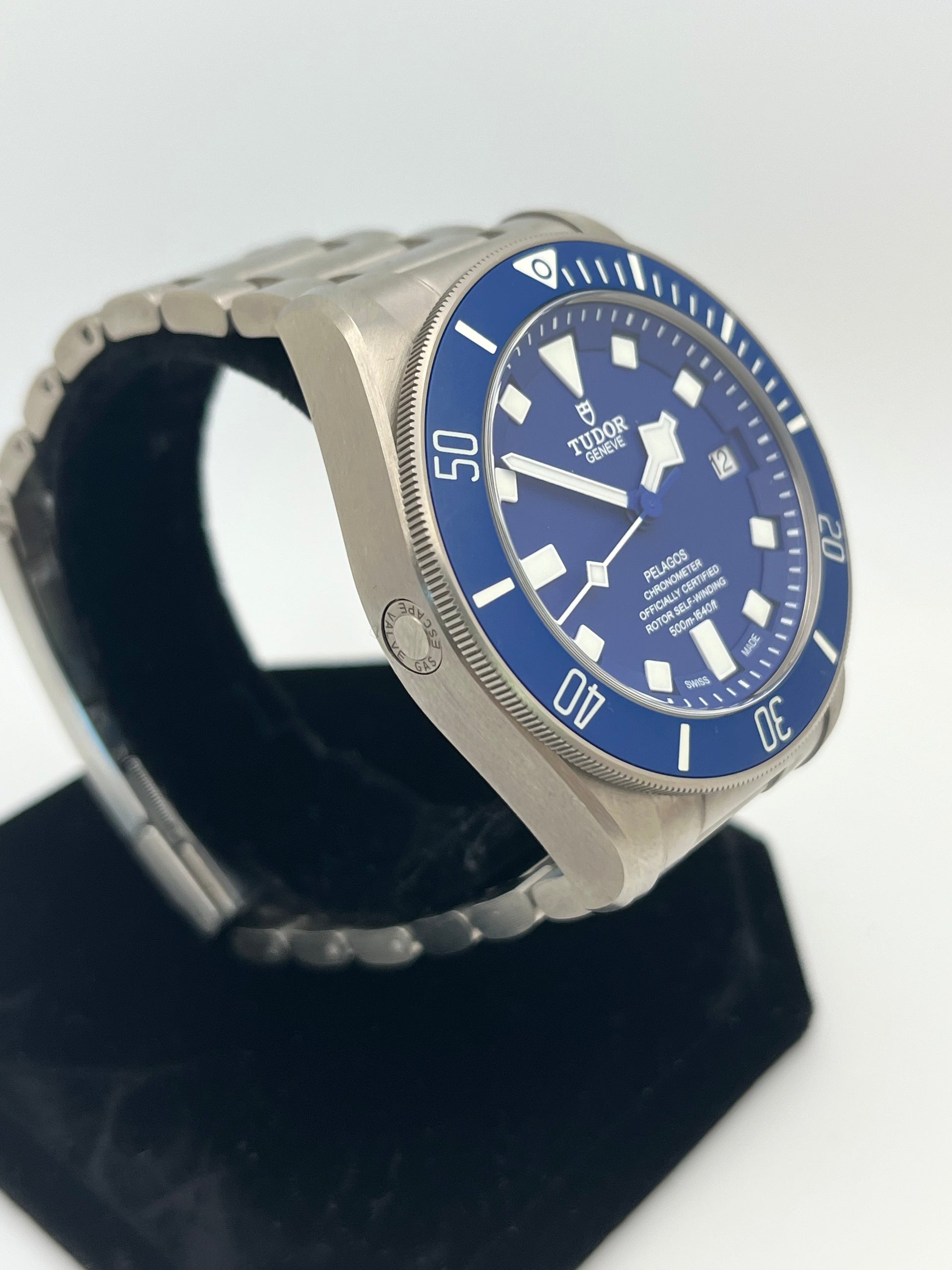 A professional-grade dive watch engineered for performance. The Pelagos 25600TB features a lightweight titanium case and bracelet, striking matte blue dial and bezel, and a helium escape valve for deep-sea reliability. Powered by Tudor’s in-house Caliber MT5612, it delivers exceptional accuracy and a 70-hour power reserve — built for serious divers and everyday wear alike.